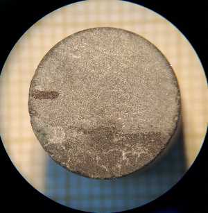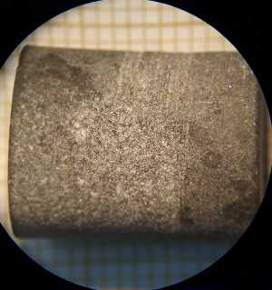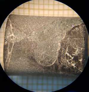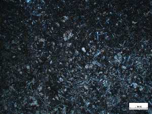 Minerais pretos granulares com iridescência estão presentes no material microfanerítico supracitado, com granulação muito fina (< 1 mm).