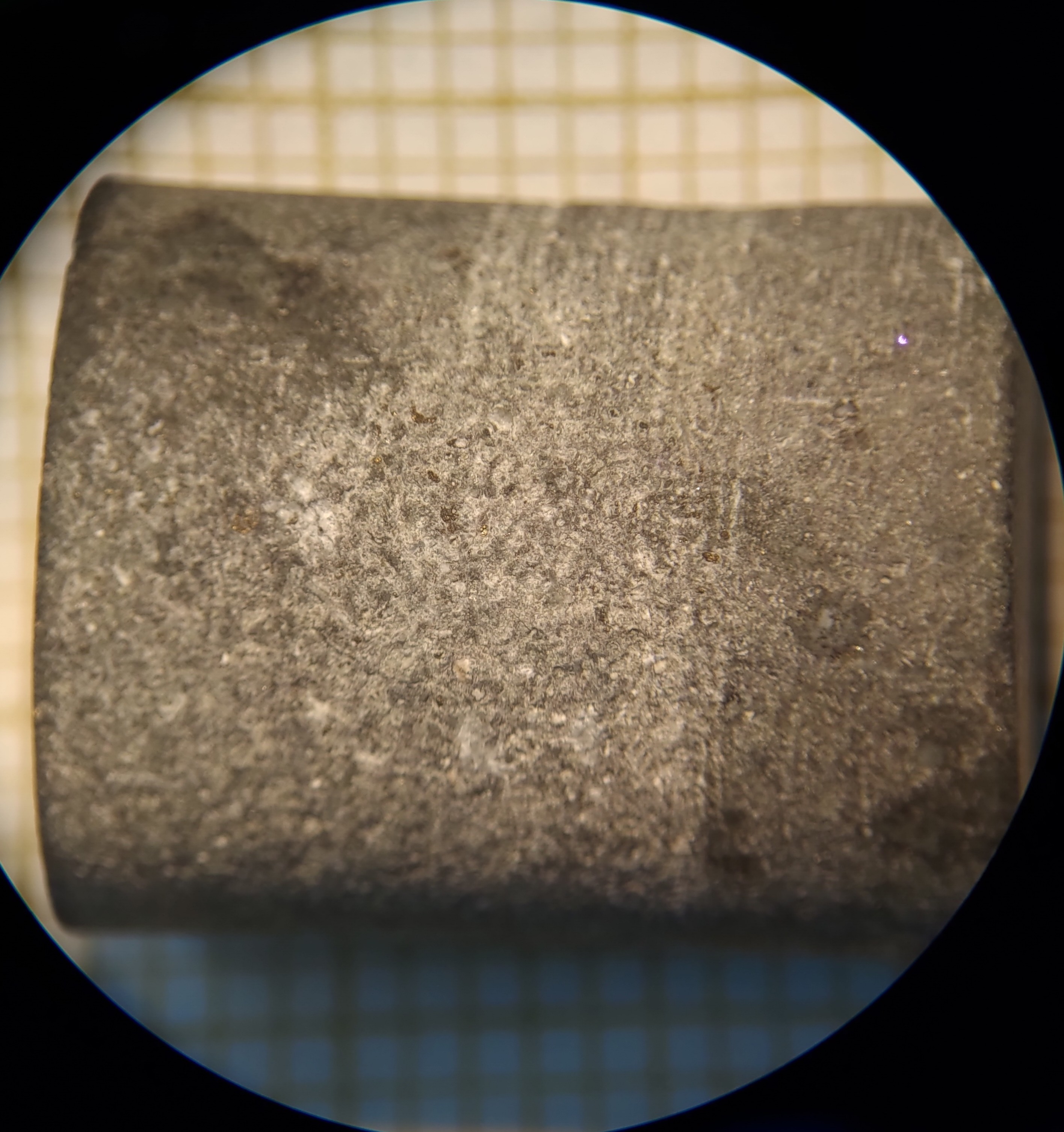A amostra é predominantemente microfanerítica, sendo possível observar grãos de feldspato e clorita, que corresponde a porção cristalina da amostra.