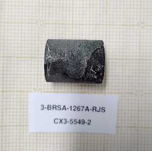 A amostra parece representar uma imiscibilidade de líquidos. Ela possui três cores, que devem representar três líquidos magmáticos distintos: o primeiro, em ordem de predominância, corresponde a um material de cor cinza, microfanerítico com grãos brancos colunares visíveis sob lupa binocular, possivelmente feldspato, e material esverdeado, com aspecto vítreo, provavelmente clorita; o segundo corresponde a um material de cor preta, afanítico, bastante fraturado, sendo estas fraturas preenchidas por material de cor branca, possivelmente carbonato; o terceiro corresponde a um material de cor verde azulado, afanítico, com aspecto maciço e também fraturado.