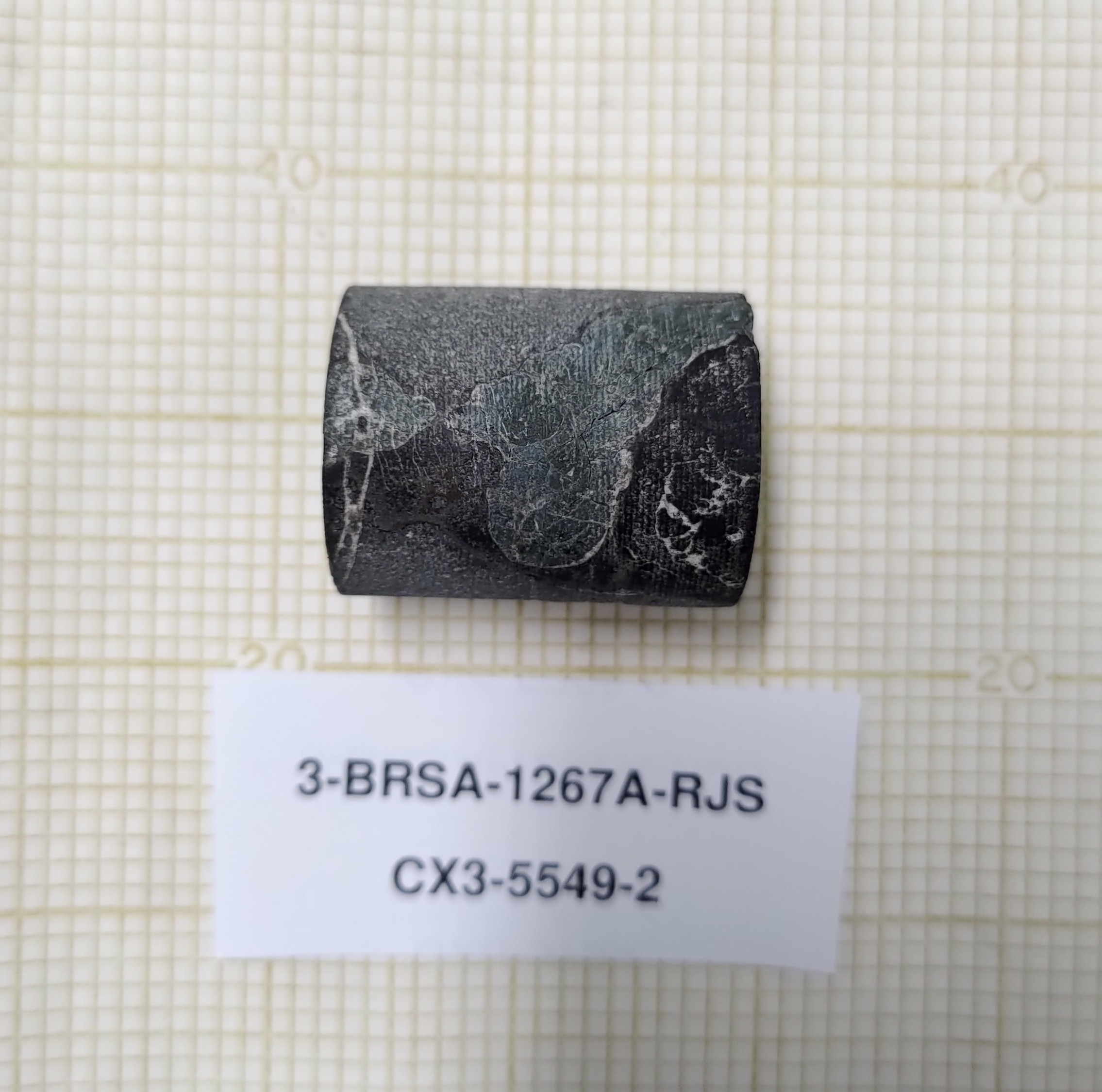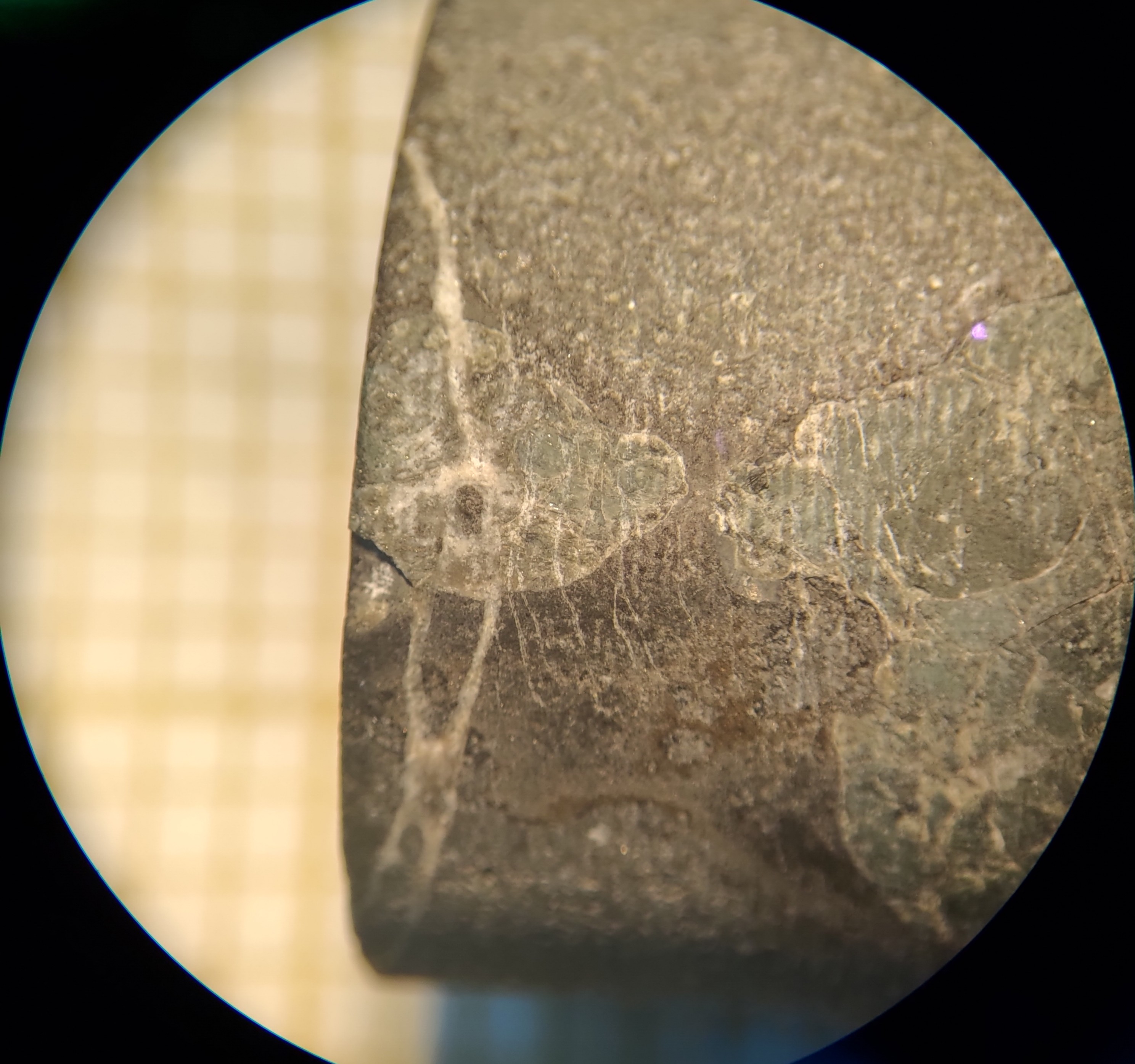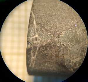 As fraturas são submilimétricas e encontram-se em todas as três partes da amostra. As fraturas são disseminadas por toda a amostra, porém há fraturas que cortam, ao mesmo tempo, as três porções discriminadas anteriormente (vide foto). A maior parte das fraturas estão preenchidas por material de cor branca, possivelmente carbonato.