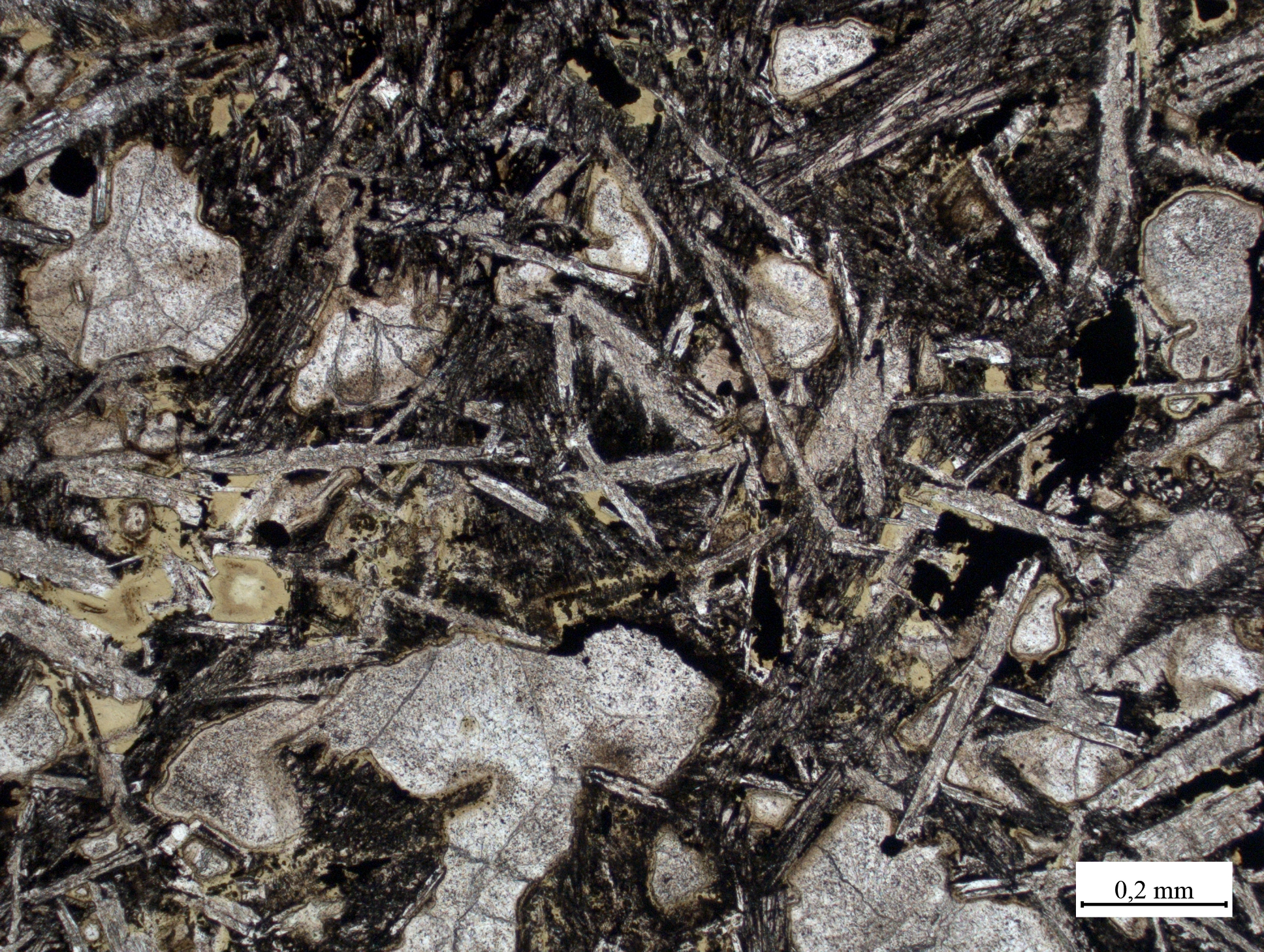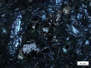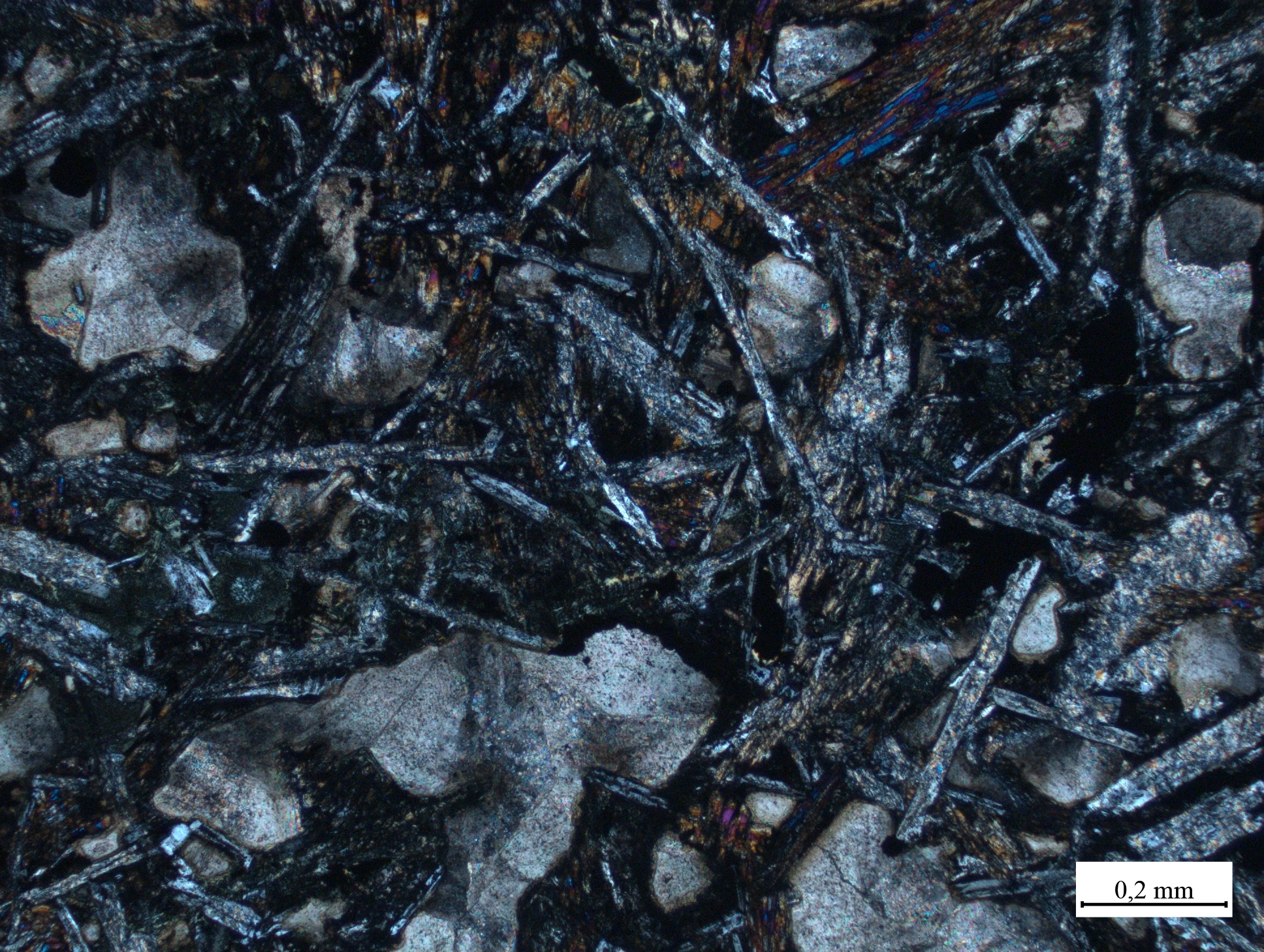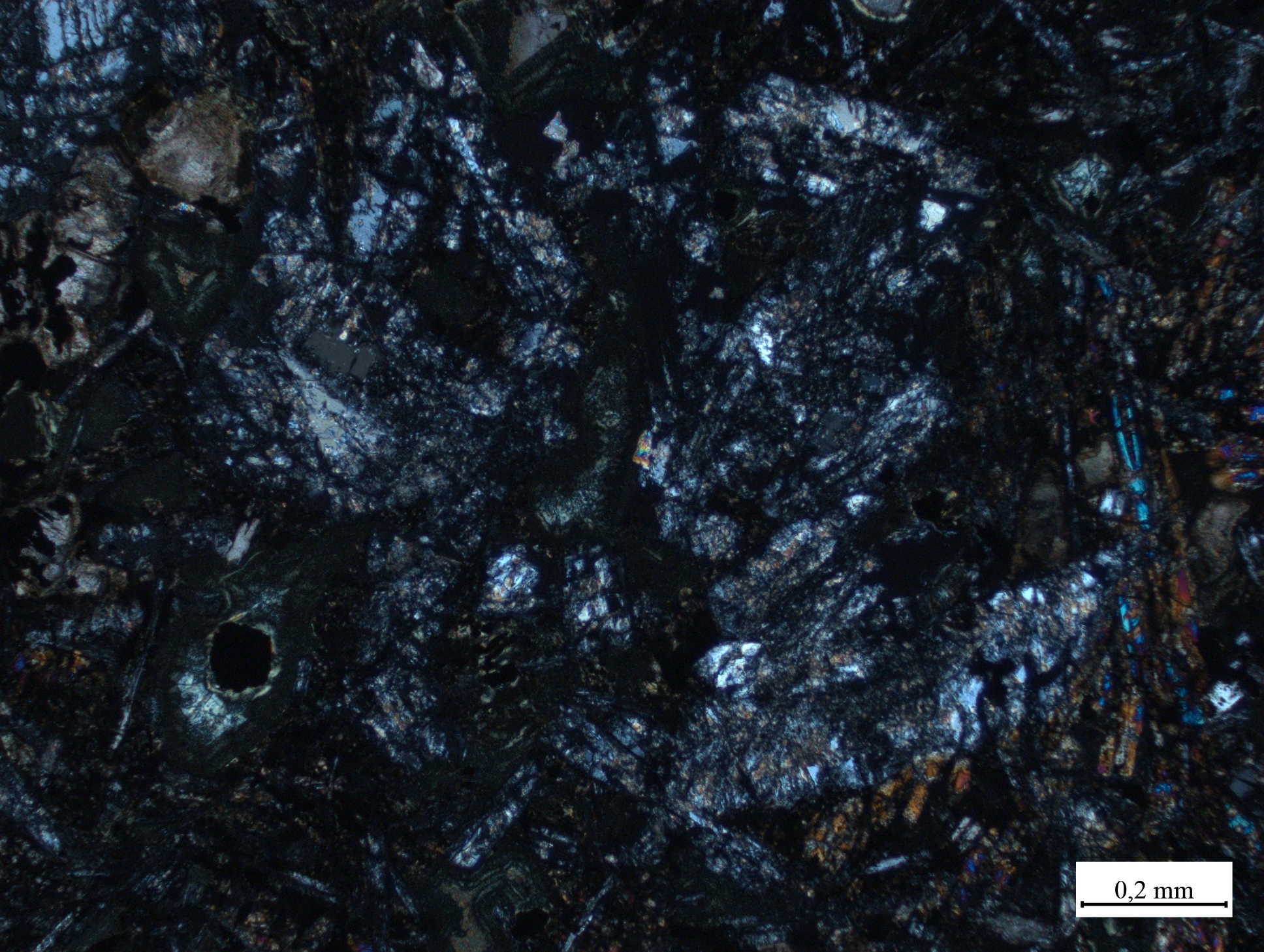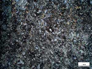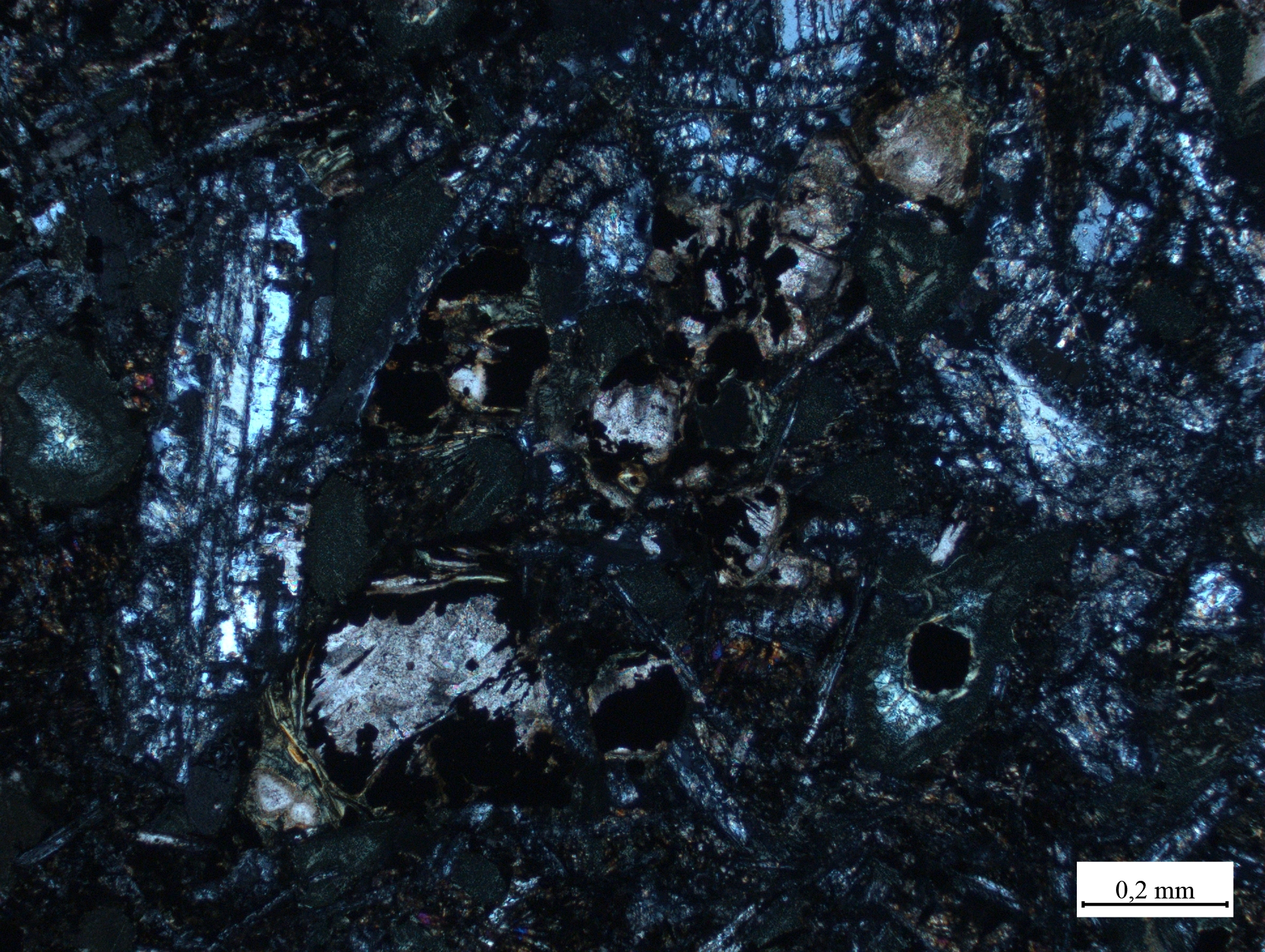 Litologia (2): A matriz é formada predominantemente por cristais muito finos a finos (< 1 mm) de plagioclásio e piroxênio, além de vidro vulcânico (alterado parcialmente para palagonita) em menor quantidade.