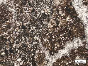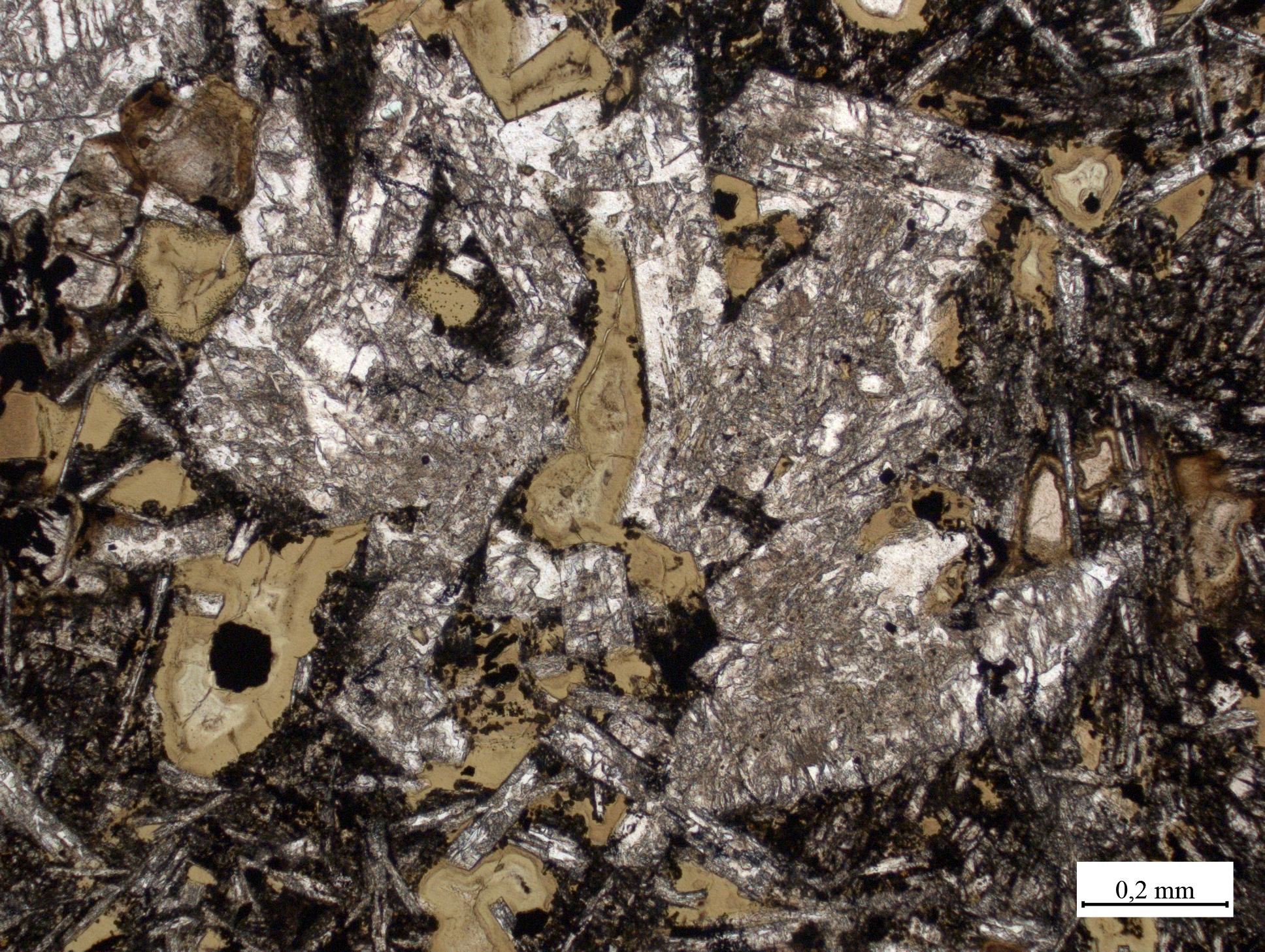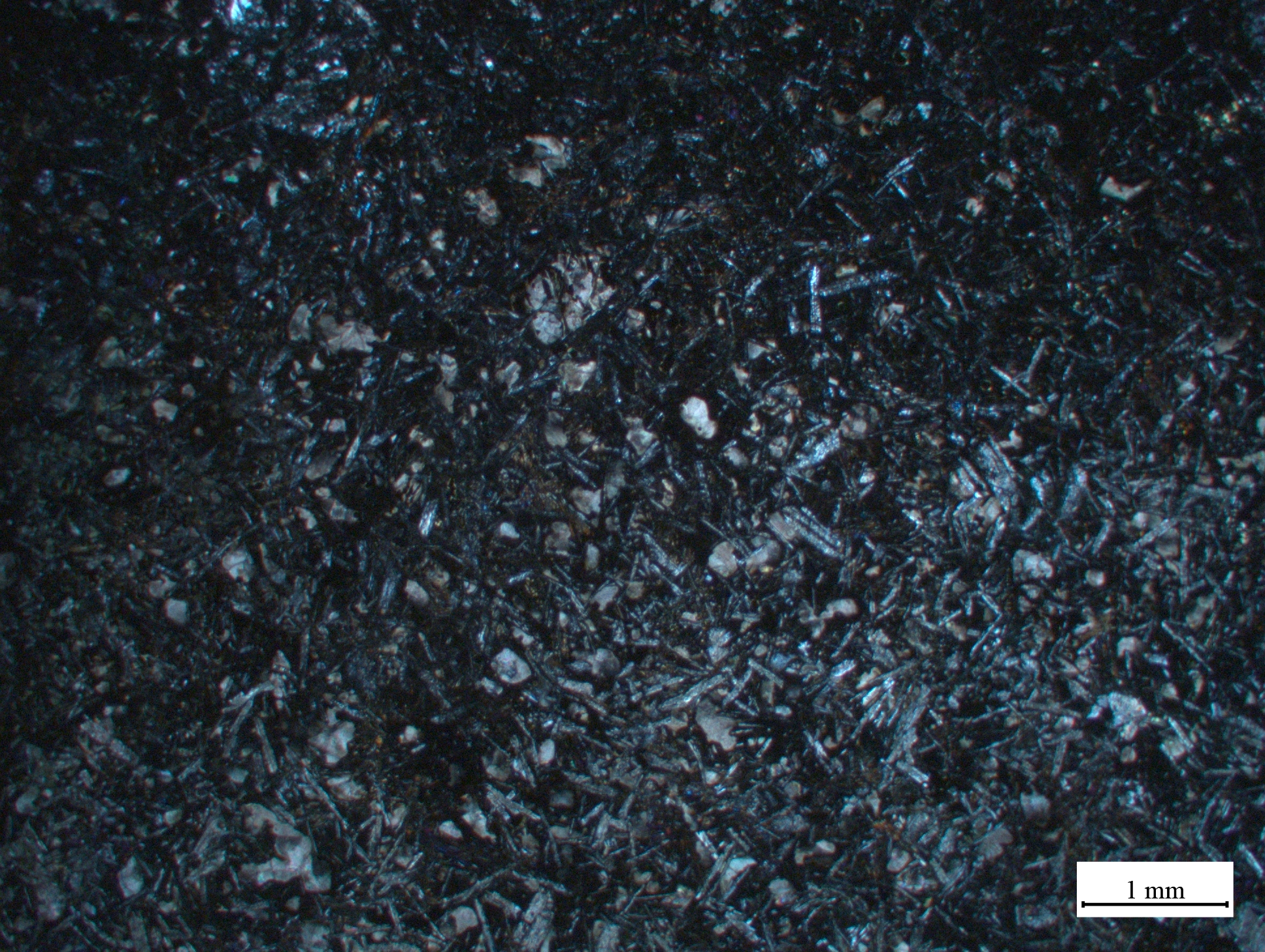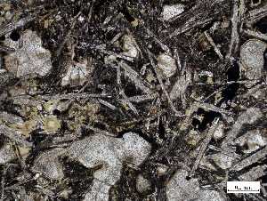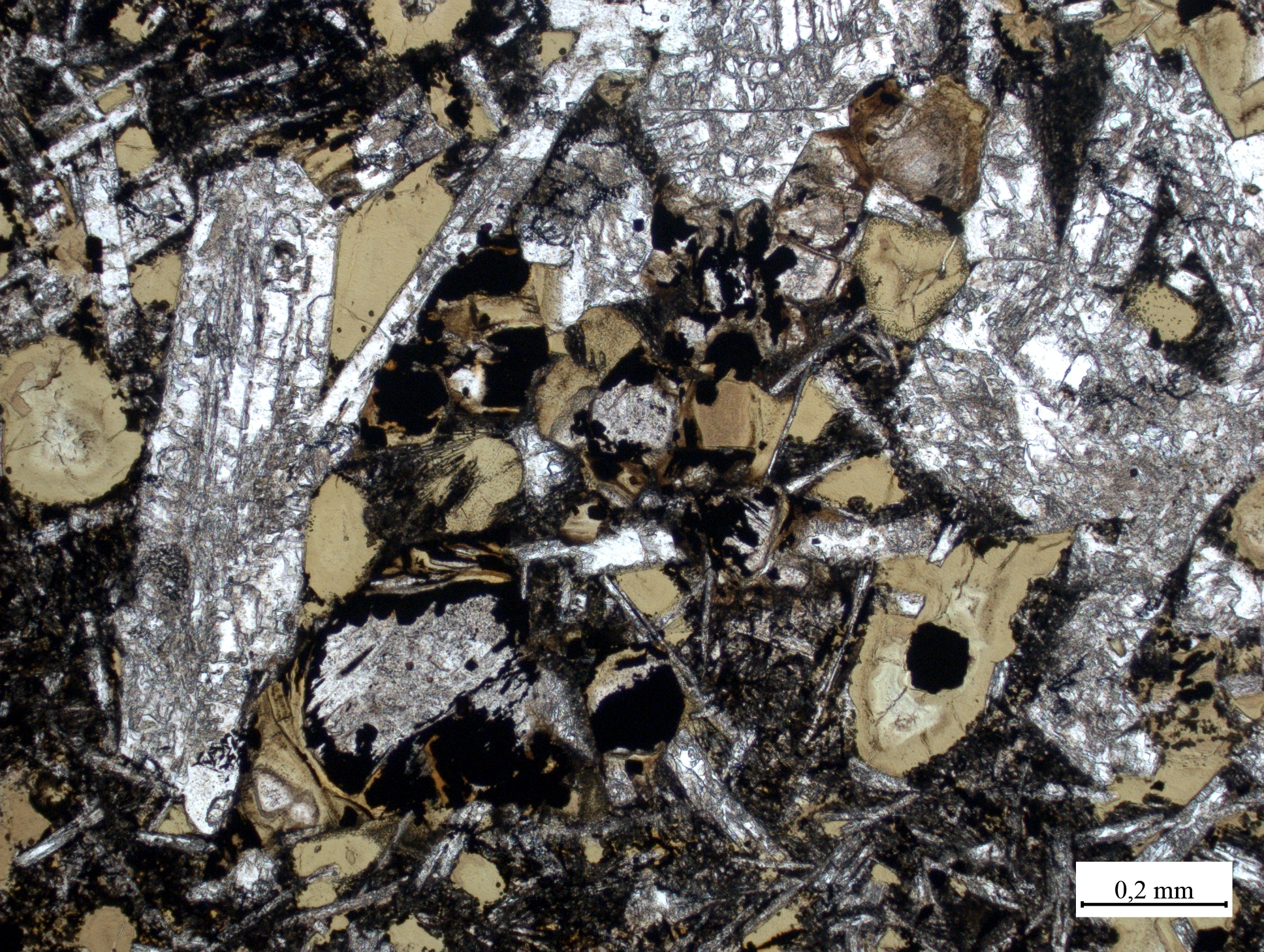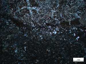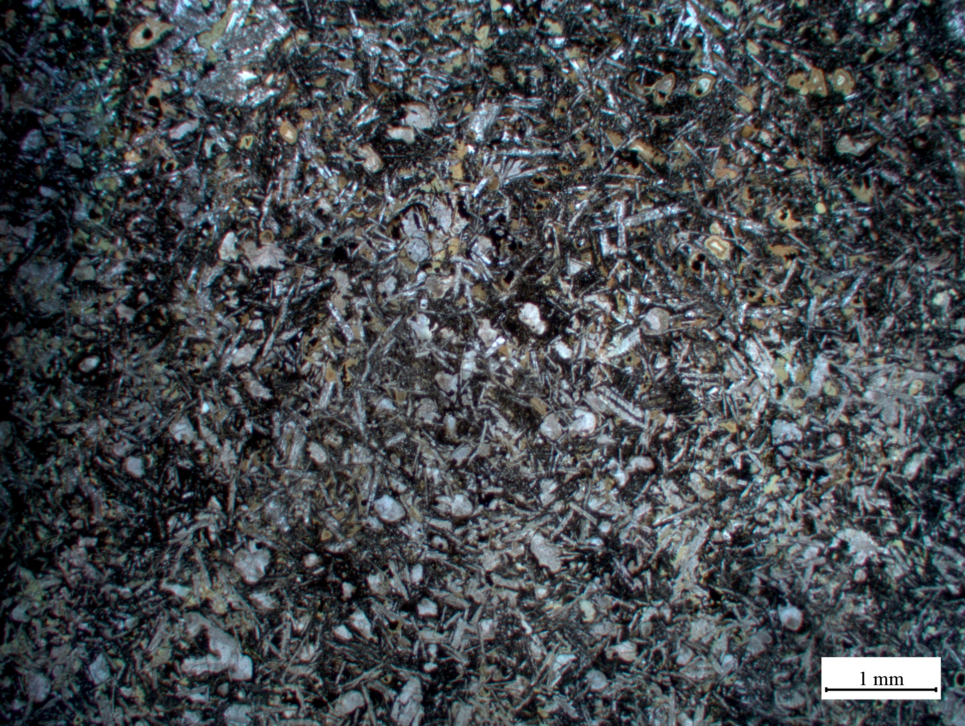 Litologia (2): A matriz é formada predominantemente por cristais muito finos a finos (< 1 mm) de plagioclásio e piroxênio, além de vidro vulcânico (alterado parcialmente para palagonita) em menor quantidade.