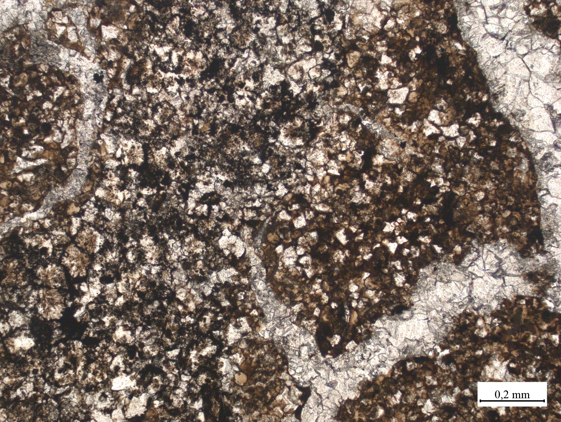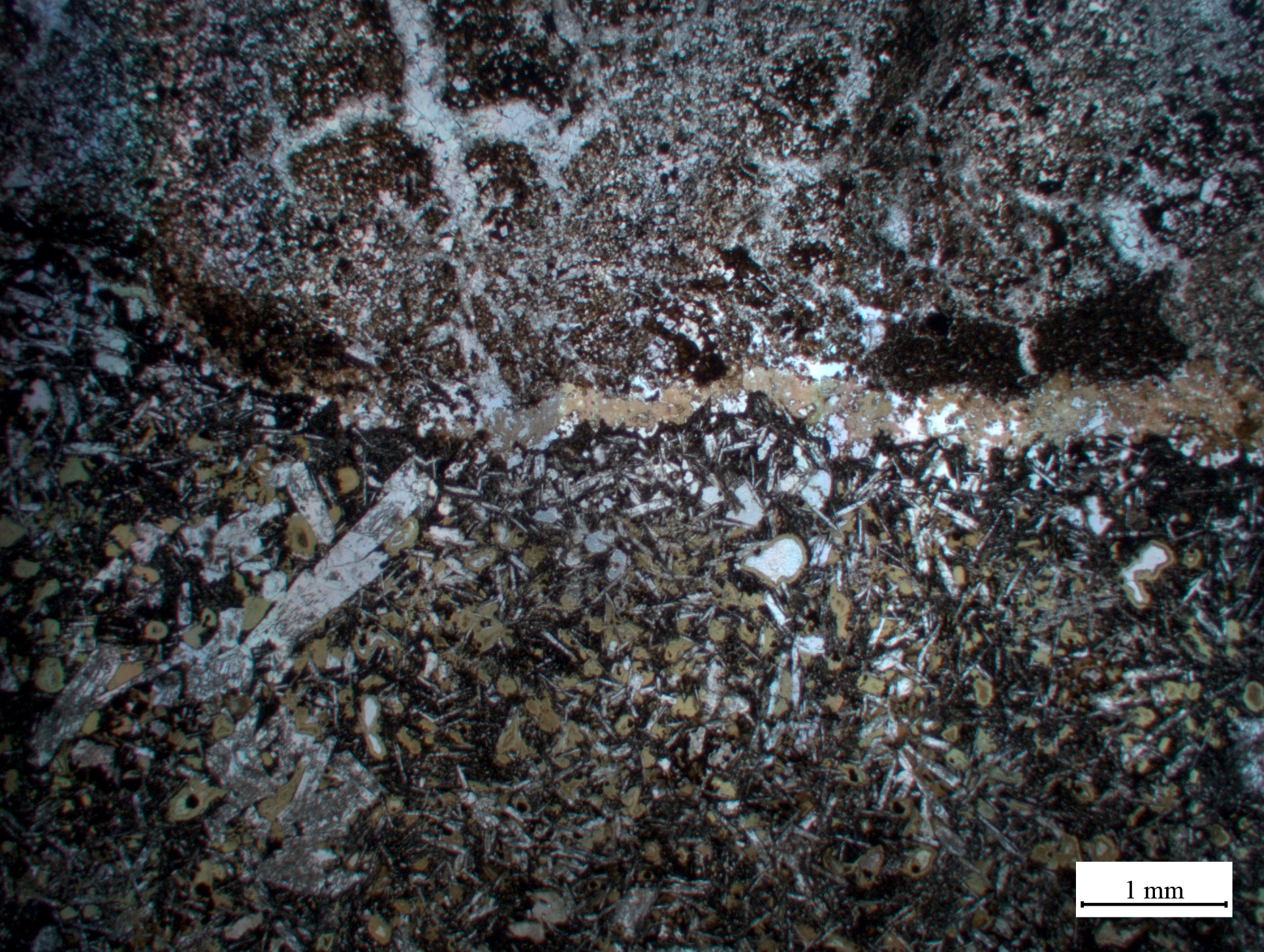 1) Parte da amostra possui cor natural marrom, clastos de carbonato angulosos (70%) em granulação entre areia fina e silte (0,03 a 0,07 mm), matriz carbonática (25%) de granulação muito fina (micrítica), presença de grãos muito finos (< 0,02 mm) de plagioclásio (<1%) e minerais opacos (5%), amígdalas esféricas/achatadas (< 0,2 mm), preenchidas por zeólita e carbonato, dentro de uma amígdala maior (~2 mm), preenchida por carbonato e palagonita (material amarelado, cor de interferência cinza esverdeado). Há diversos veios de carbonato (calcita espática) cortando essa porção da amostra.