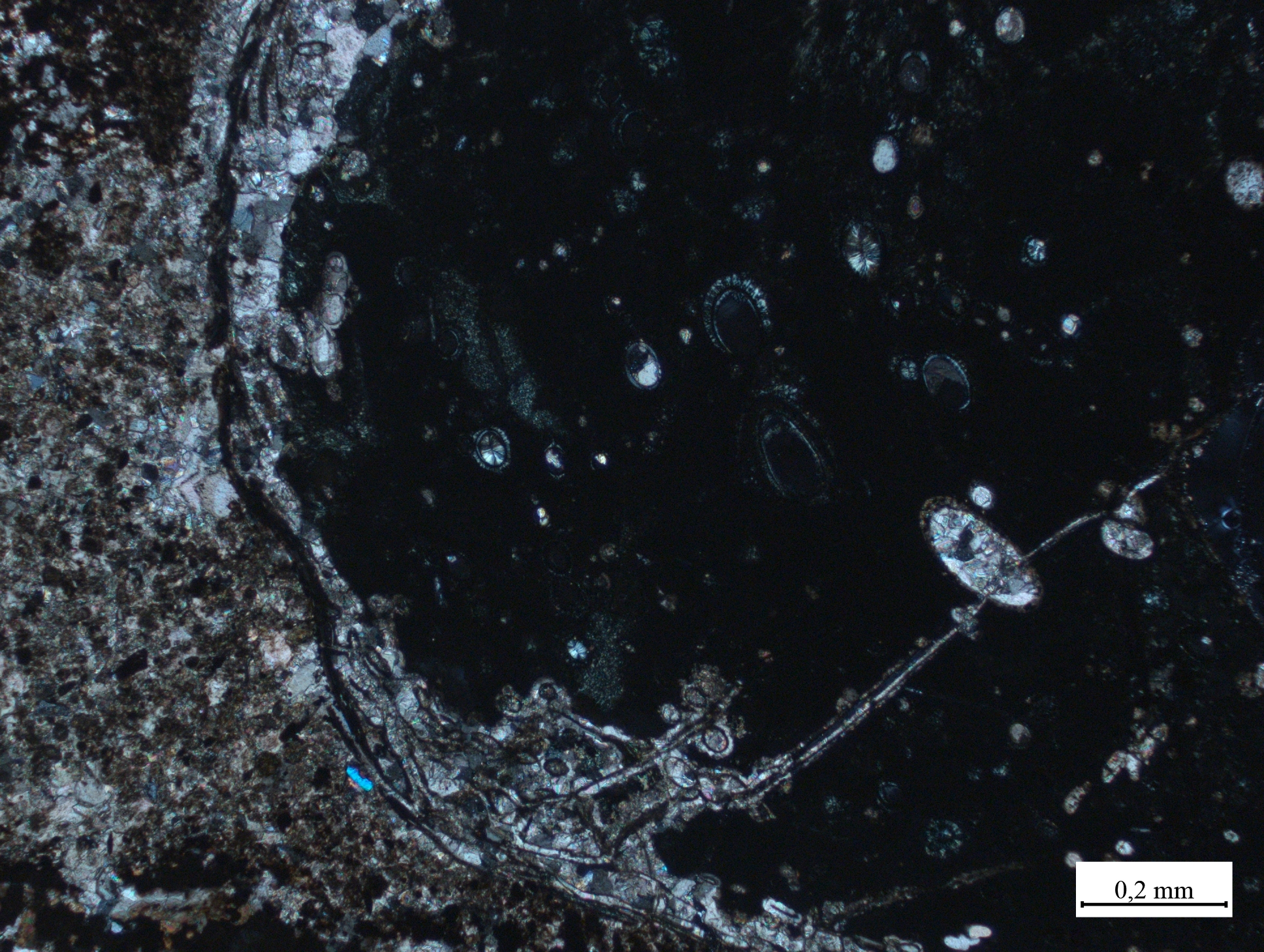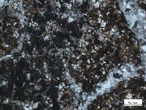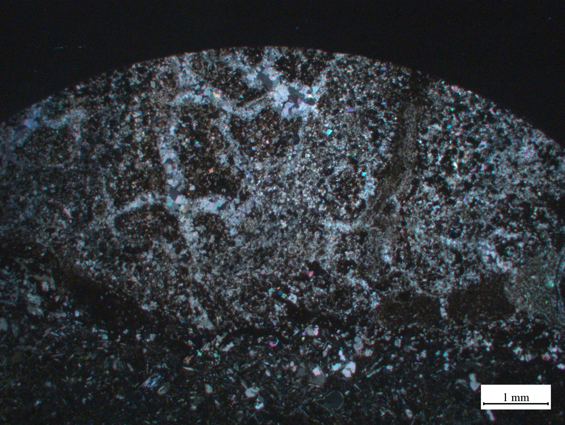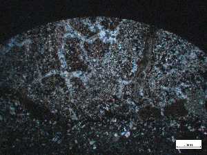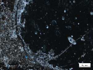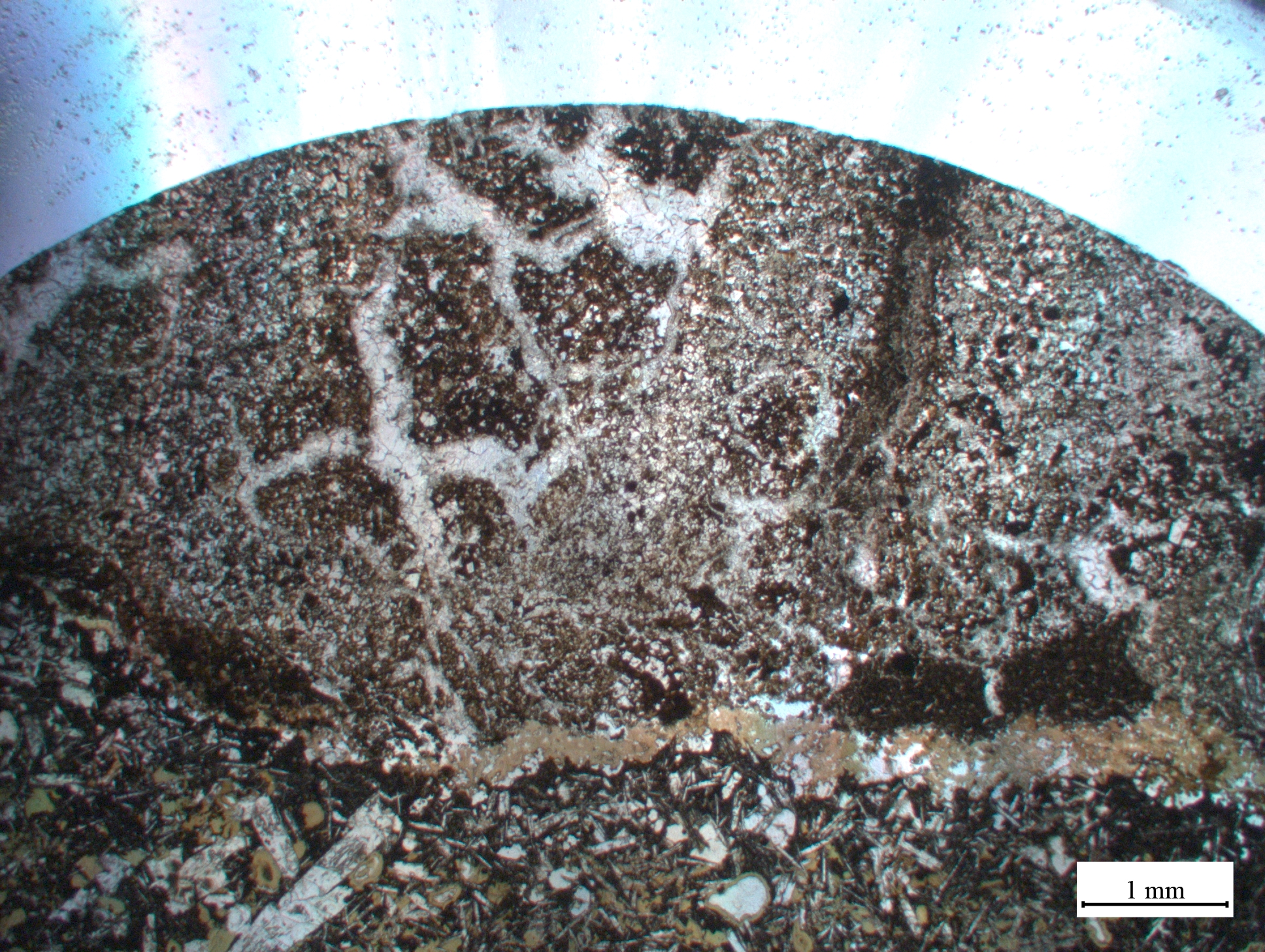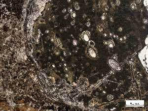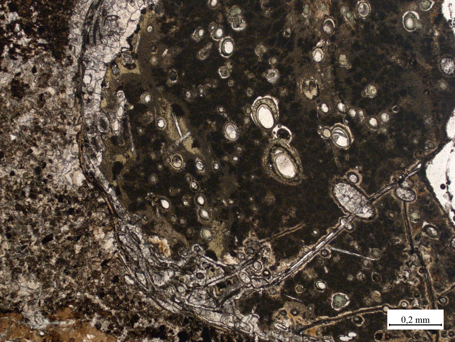 Litologia (1): Amígdalas esféricas/achatadas menores que 0,2 mm, preenchidas por zeólita e carbonato, inclusas em uma única amígdala de tamanho maior (~2 mm), preenchida predominantemente por palagonita (no centro) e, subordinadamente, por carbonato (próximo das bordas).