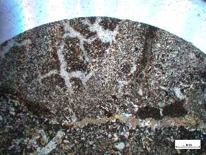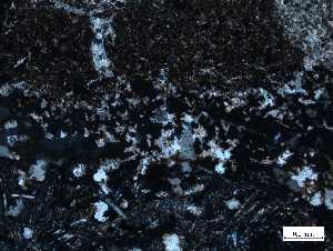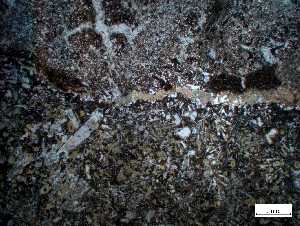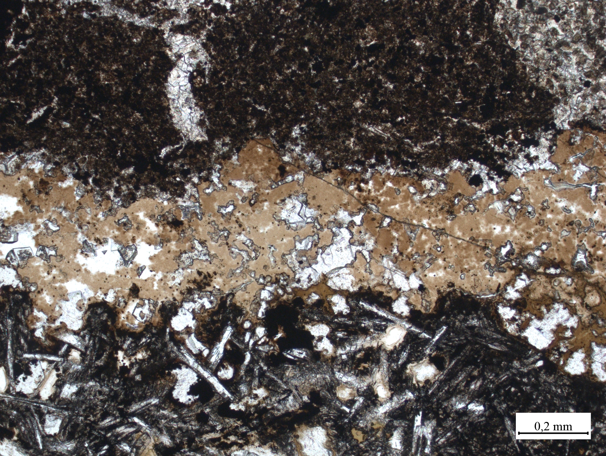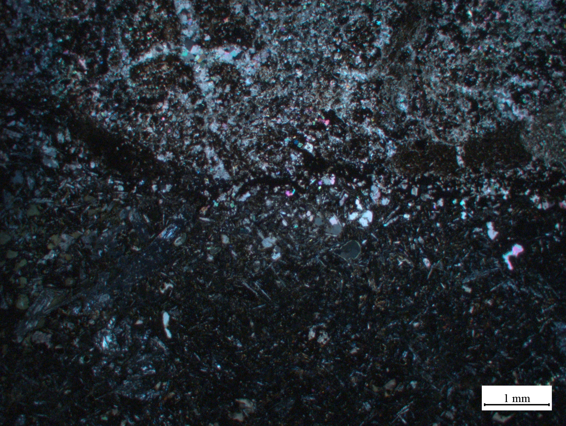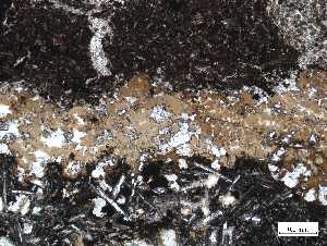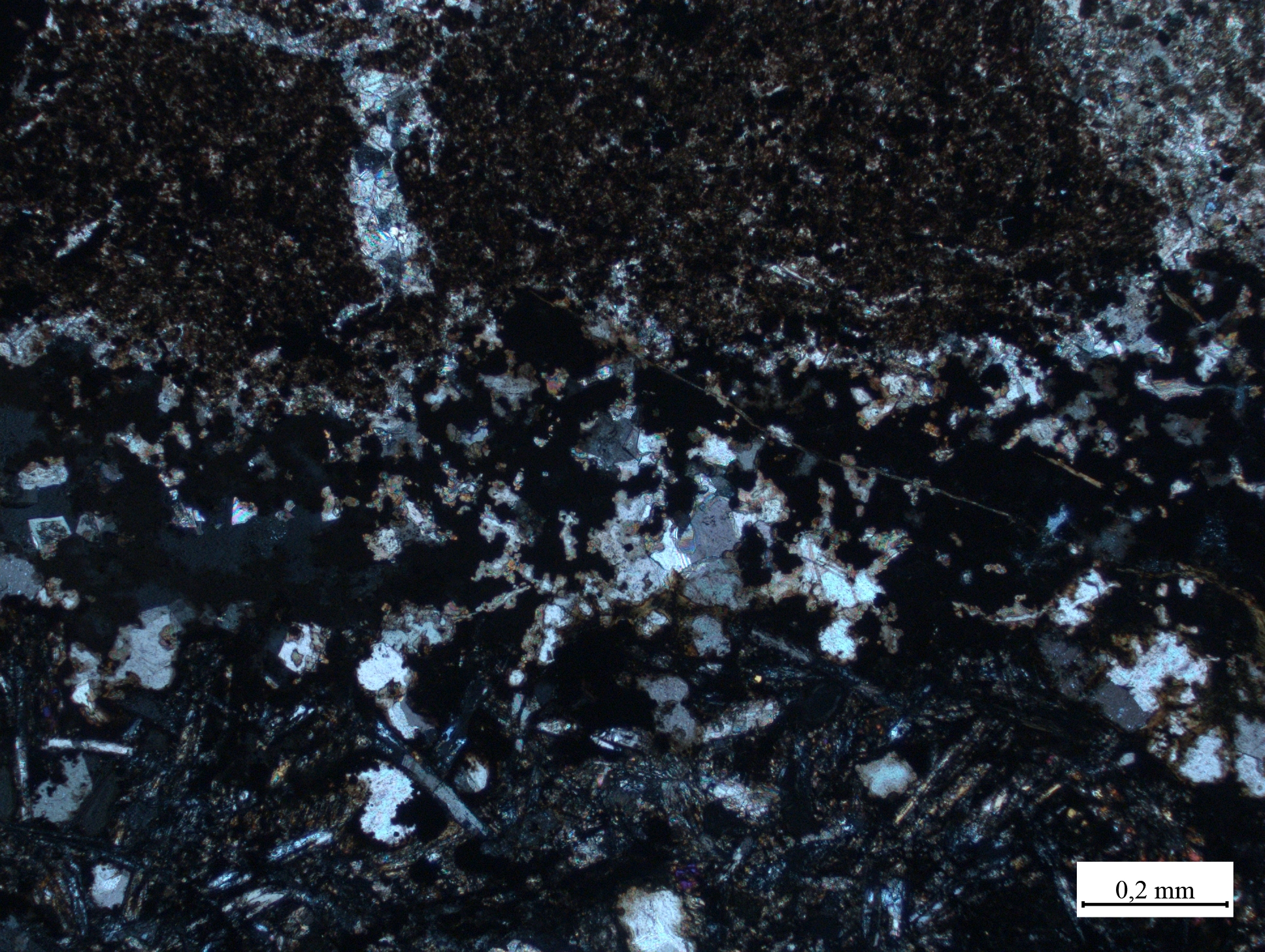 Próximo ao contato entre as duas litologias há bastante carbonato e material vítreo (cor laranja sob luz polarizada e isótropico/cor de interferência cinza alaranjado), preenchendo fraturas. Presença de minerais opacos em ambas litologias.